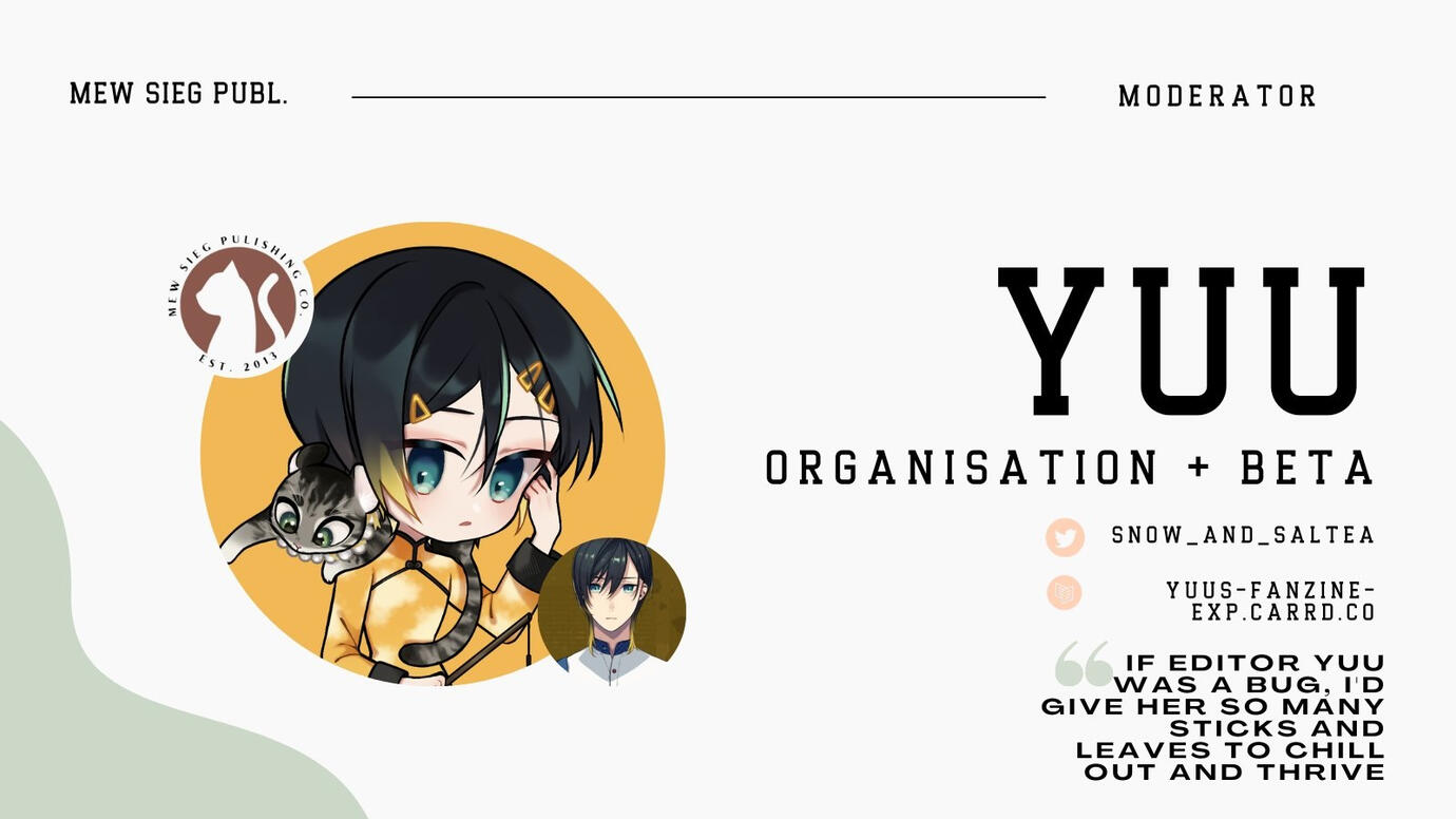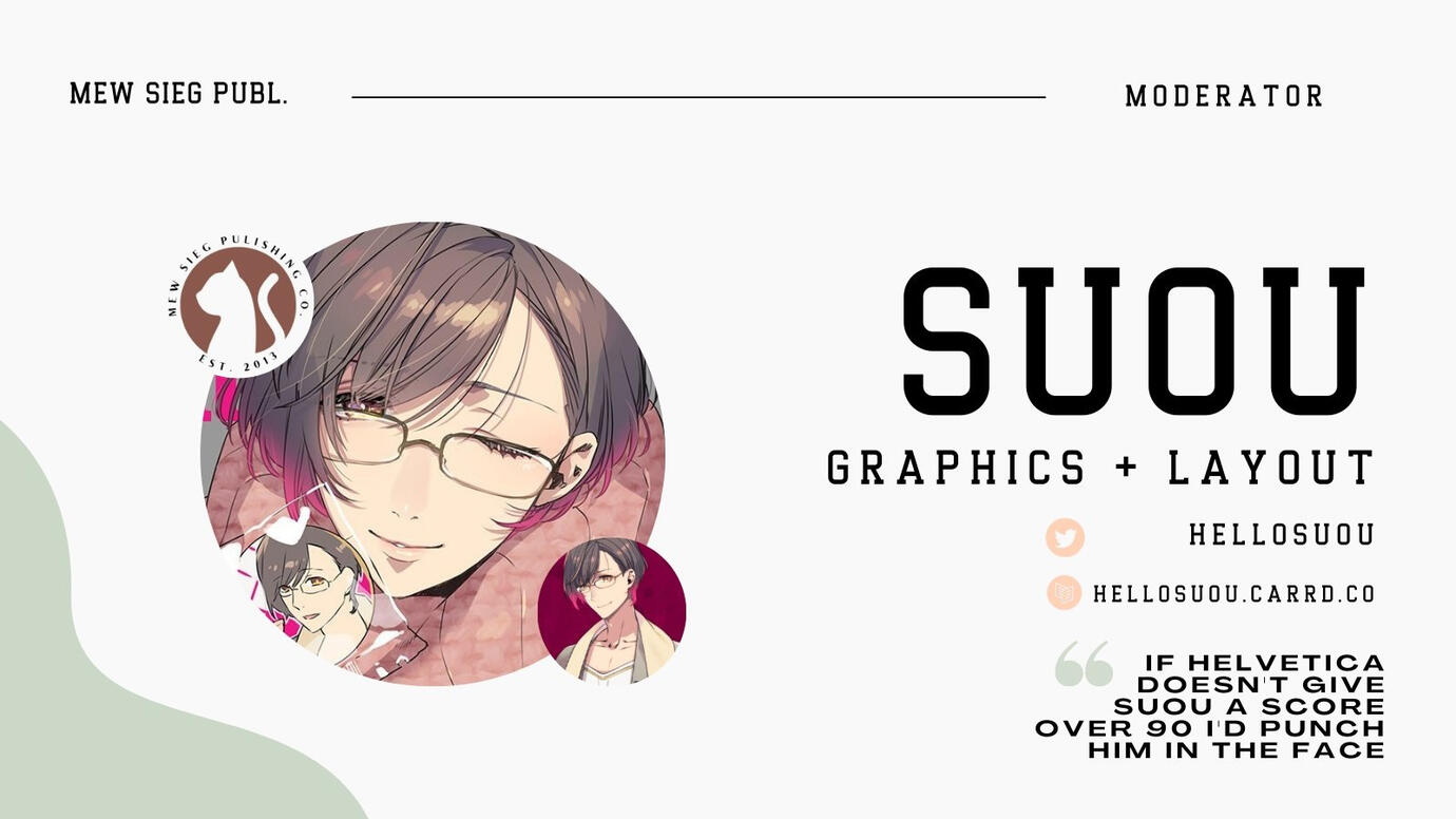Exclusively powered by concentrating her thoughts on a nihilistic depressed emo hitman voiced by Yoshimasa Hosoya. Decided to join Mew Sieg Publishing after suddenly realizing she has not stopped thinking about New Sieg for seven months. Publishing interests include critical essays on visual novels, and having more derivative fiction about a particular hot hitman. Once wrote a 3000-word essay about said hitman.